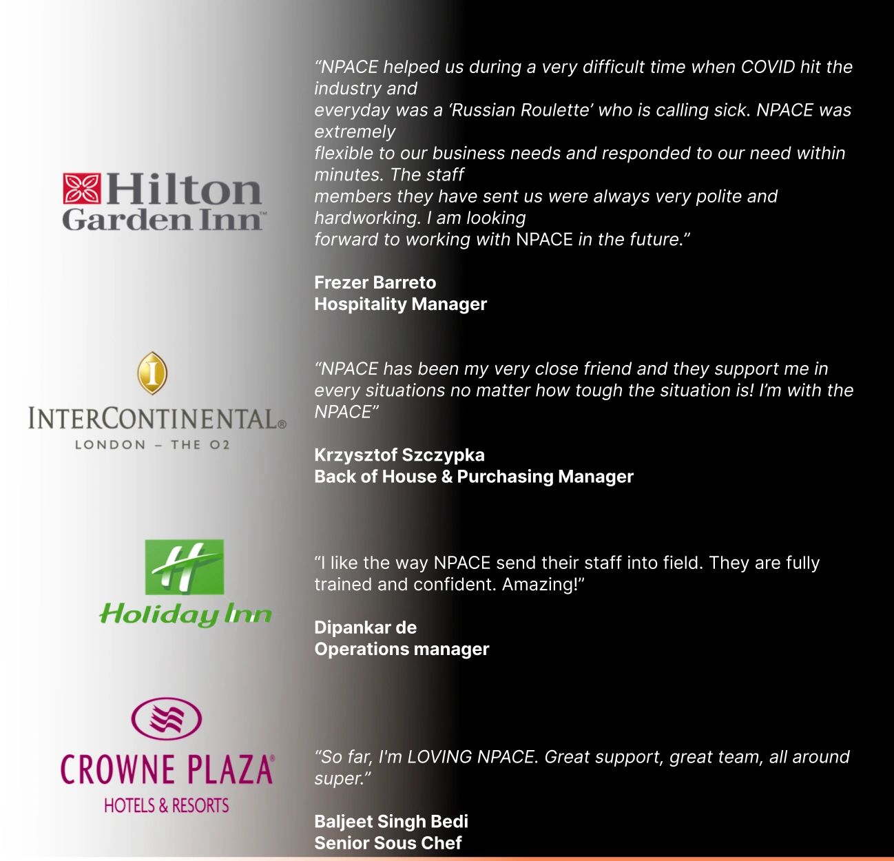 With more than 4500 registered workers inside the UK, hundreds of companies rely on NPACE recruitment to fill a wide range ofroles in the hospitality, events sectors, hospitals, office, security, retail, and logistics.